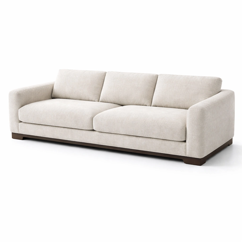 Sofá de tela beige con estructura de madera de pino de tres plazas